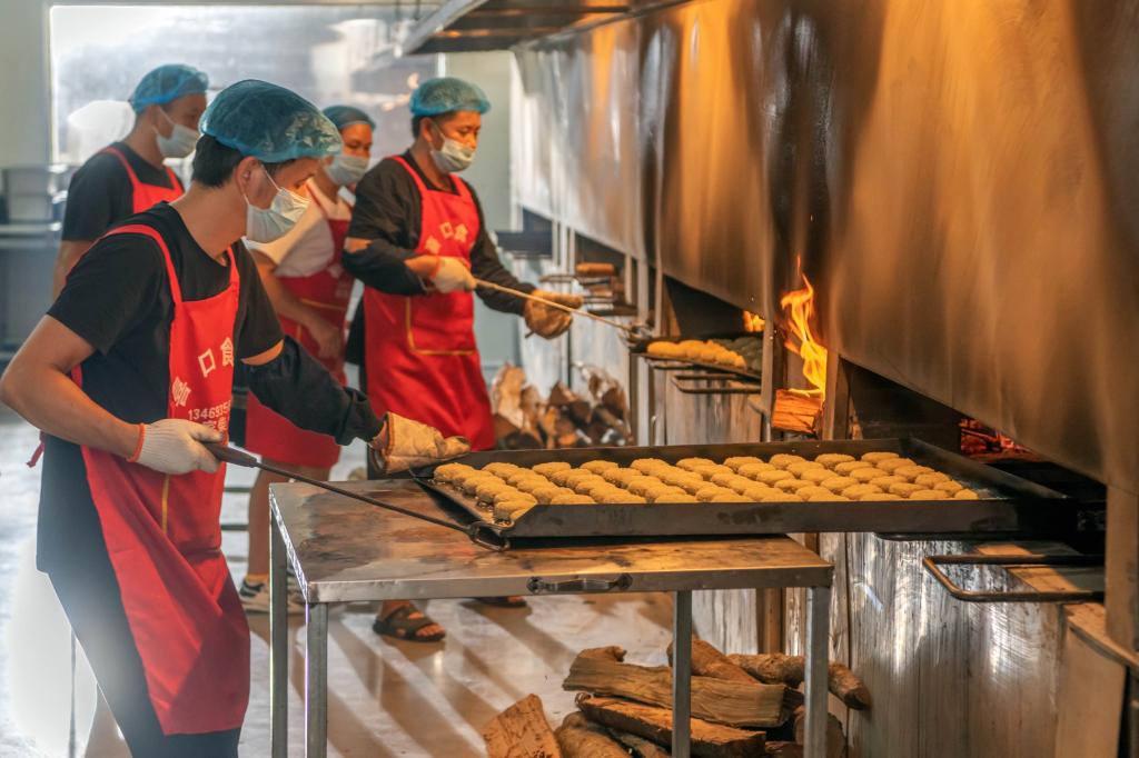在湖南省会同县堡子镇一家月饼厂,工作人员将月饼放进柴火炉里烘烤。(张镭 摄)