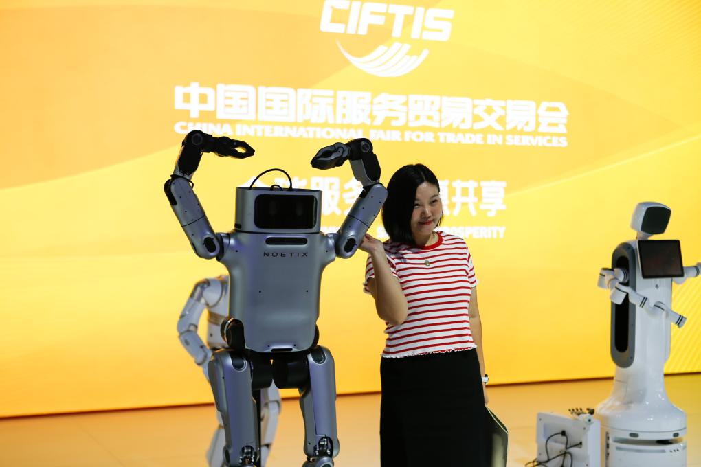 9月13日,参观者在服贸会国家会议中心会场与机器人合影。本届服贸会聚焦新质生产力,新技术、新场景亮点纷呈,专精特新技术和应用纷纷涌现。新华社记者丁洪法摄