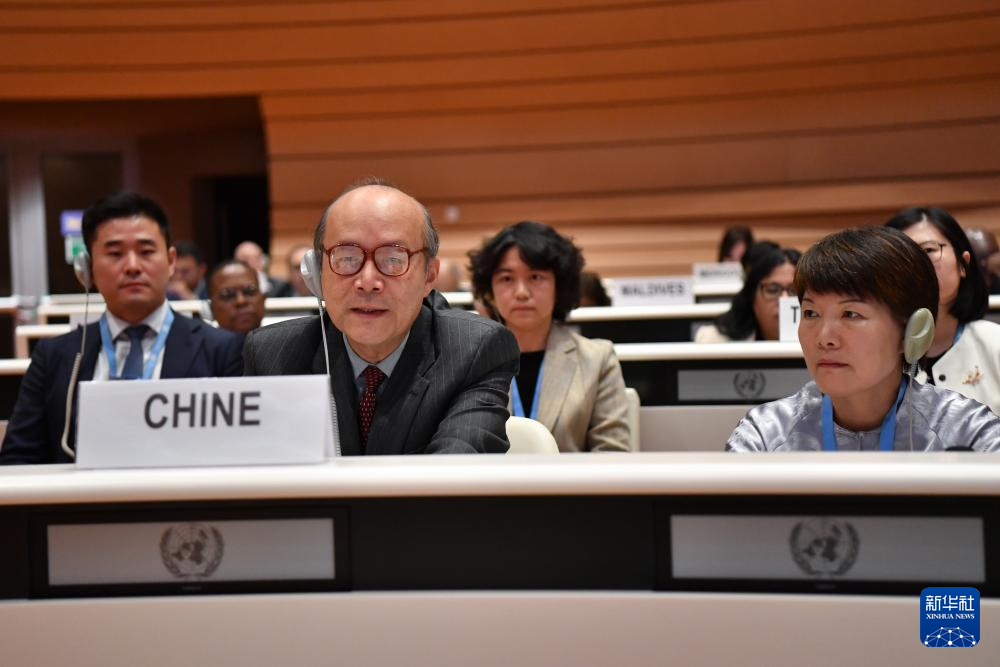9月13日,在瑞士日内瓦,中国常驻联合国日内瓦办事处和瑞士其他国际组织代表陈旭大使(前左)在庆祝活动上发言。新华社记者 连漪 摄