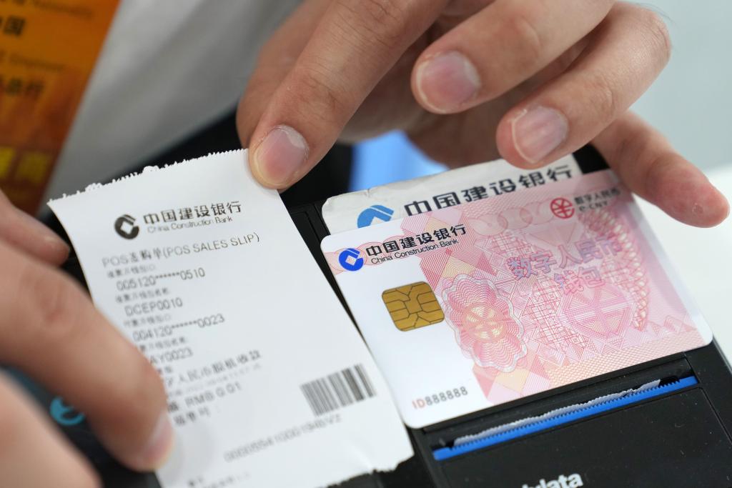 9月4日,在服贸会首钢园区金融服务专题展上,一位中国建设银行工作人员展示数字人民币双离线支付场景应用。新华社记者 鞠焕宗 摄