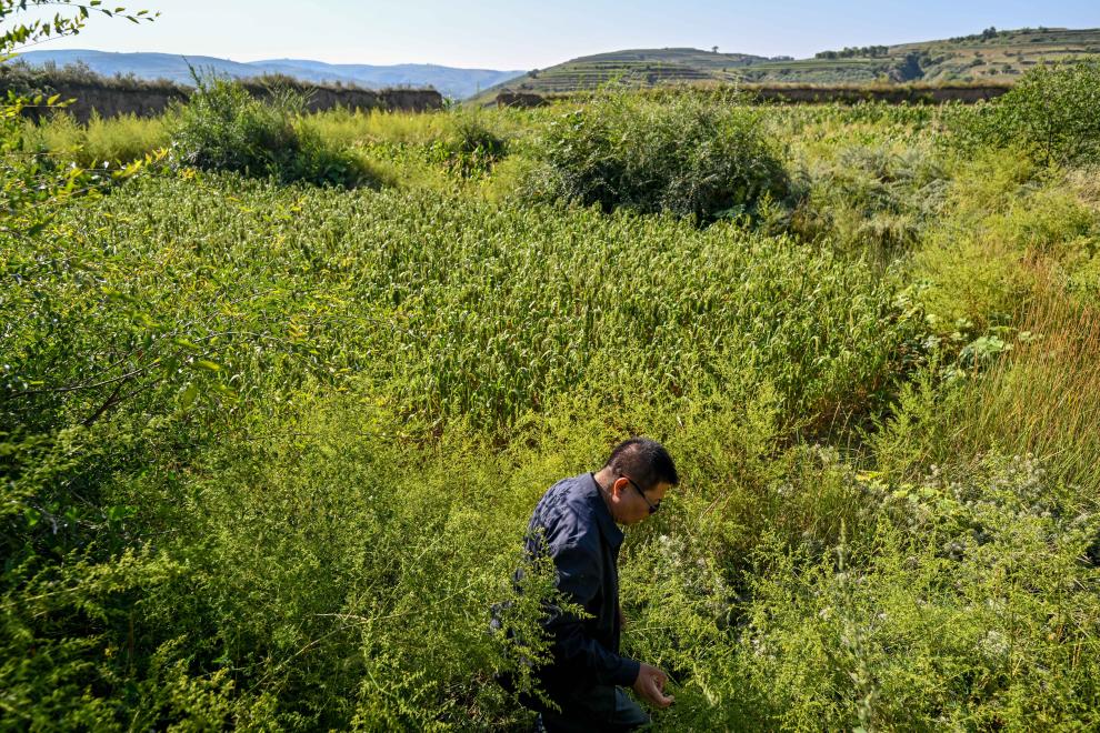 在偏关县滑石涧堡,吕成贵在草丛中寻访古堡当年的历史遗存(2023年8月29日摄)。