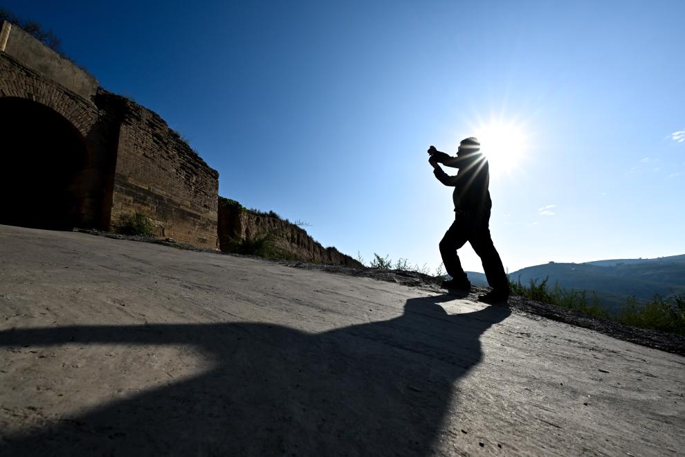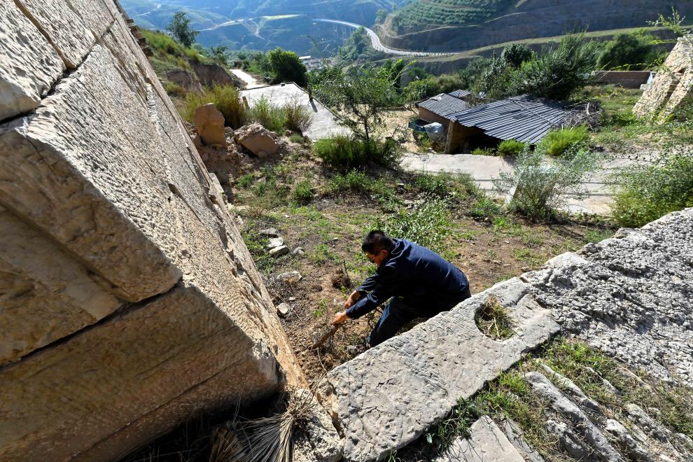 在偏关县滑石涧堡,吕成贵试图折断一棵生长在古堡大门处的野树。树木的根系往往会导致墙体胀坏或开裂,是破坏长城的潜在威胁之一(2023年8月29日摄)。