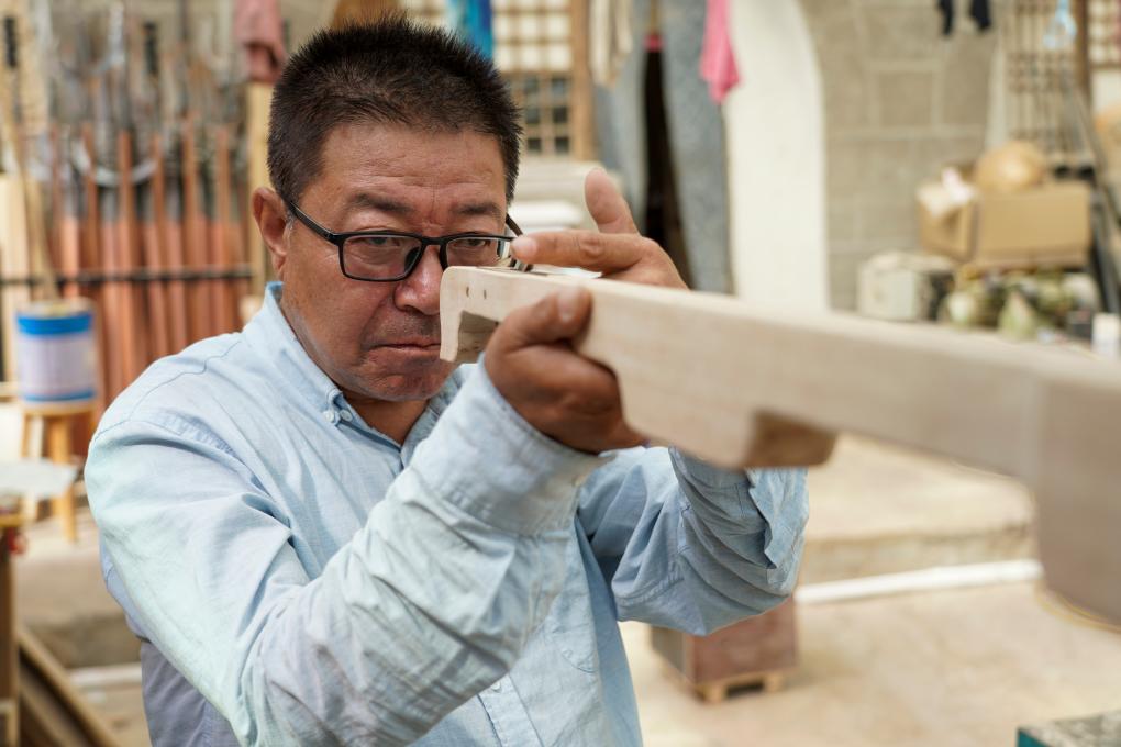 在偏关县老牛湾村,吕成贵在调试其制作的长城文创产品(2023年8月28日摄)。新华社记者 杨晨光 摄