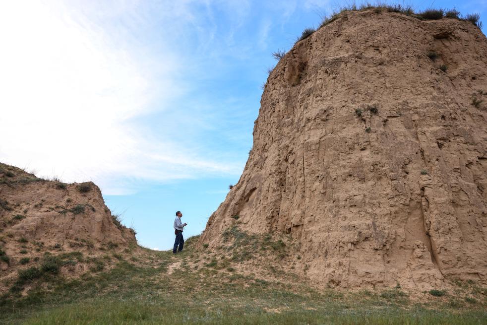 陈静和丈夫高万东来到他们自费认领的一处烽火台(2023年8月17日摄)。新华社记者 冯开华 摄