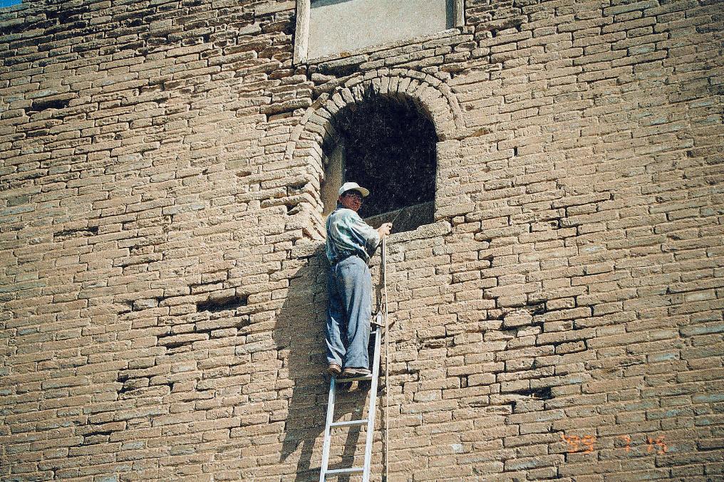 吕成贵在位于偏关县老牛湾村的望河楼考察长城(1999年7月15日摄,资料照片)。