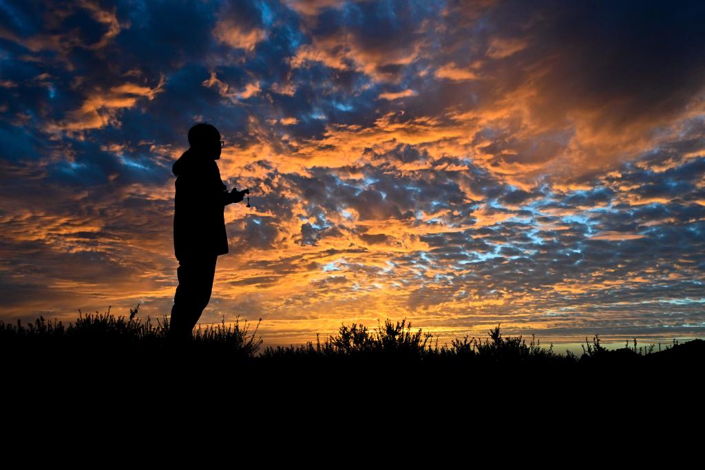 夕阳下,陈静和丈夫高万东在拍摄五墩烽火台附近的长城(2023年8月17日摄)。新华社记者 连振 摄