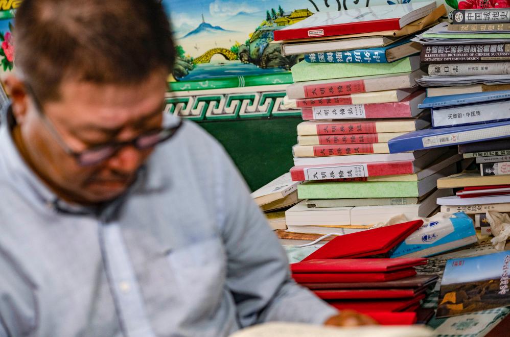 吕成贵家的炕头上堆满了与长城历史文化相关的资料(2023年8月28日摄)。新华社记者 陈钟昊 摄