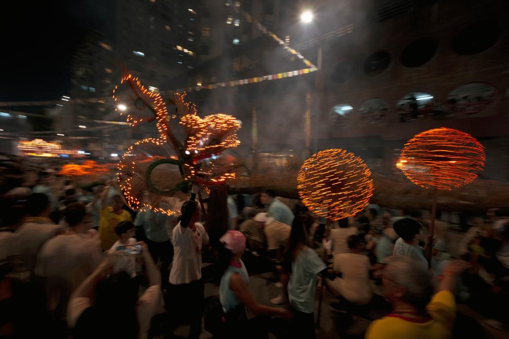 月光下,一条由竹子、藤条、麻绳和珍珠草等材料捆扎而成的龙,身上插满燃烧的香枝,伺机而动。随着“咚锵、咚锵”锣鼓声响,火龙在约300名队员的合力下从安庶庇街“冲”出人群,现场欢呼声不断……在香港大坑,有着百余年历史的传统民俗活动“大坑舞火龙”16日起一连三日上演,为全城增添节日气氛。