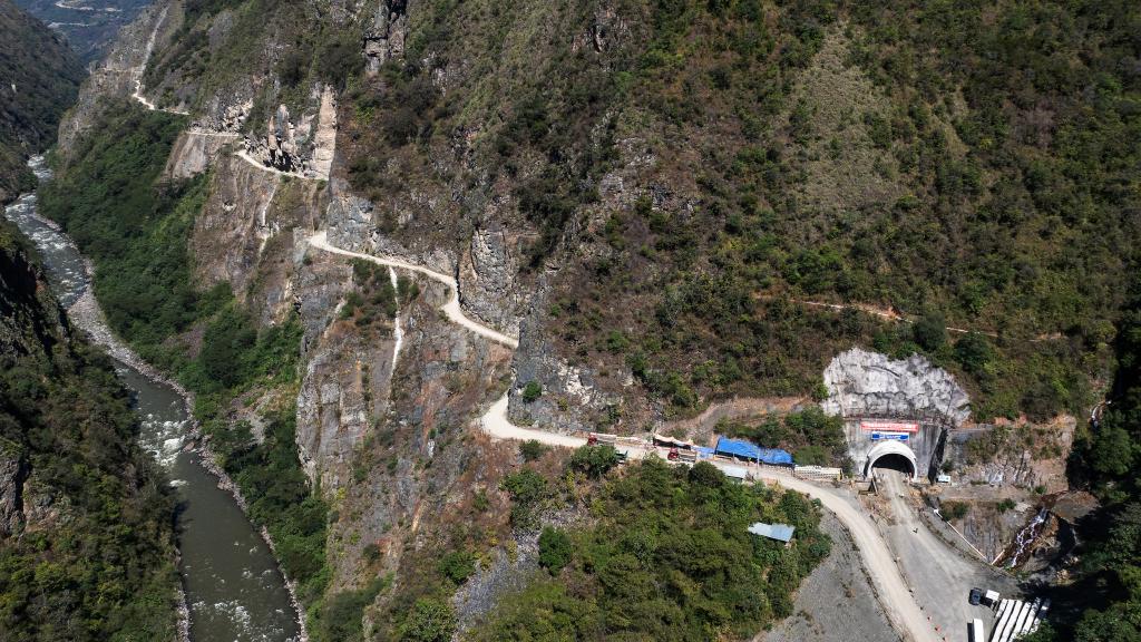 这是6月23日在秘鲁库斯科大区拍摄的中铁隧道局承建的马丘比丘公路隧道项目和旁边的悬崖峭壁(无人机照片)。新华社记者 李木子 摄