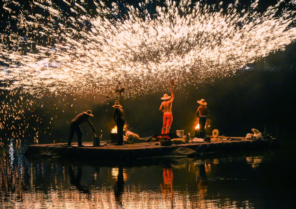 这是9月16日在安徽省宿州市砀山县梨小萌欢乐梨园景区拍摄的打铁花表演。新华社发(崔猛 摄)