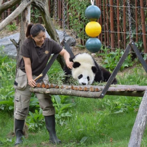 作为唯一的海外专职熊猫饲养员,刘洋陪伴“星徽”和“好好”已整整10年,其间大熊猫“天宝”和双胞胎“宝弟”“宝妹”相继在这里出生。刘洋的两个洋徒弟罗宾和马克西姆也已出师,从打扫喂食,到粪便称重,再到记录数据,研究大熊猫生活习性和饮食规律,两个人做得井井有条,就连大熊猫爱吃的秘制窝窝头也做得得心应手。