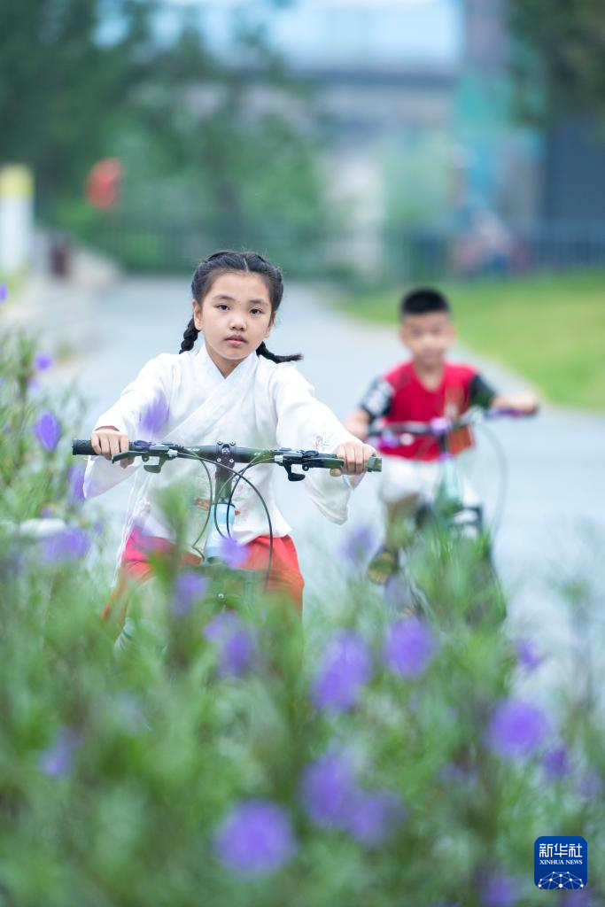9月17日,在湖南省娄底市涟水河风光带,小朋友体验骑行运动。