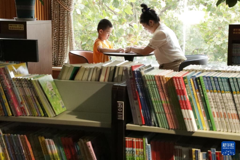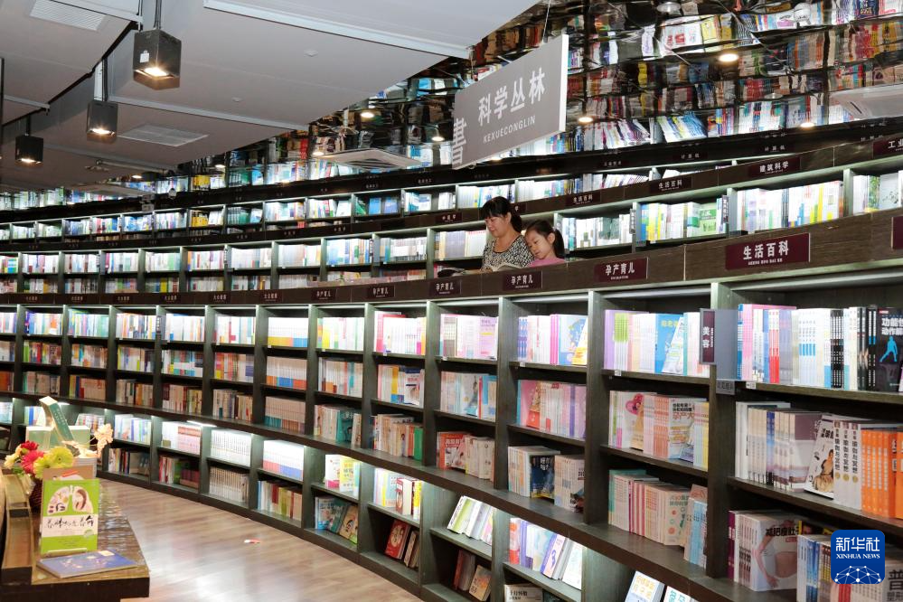 9月17日,在山东省滨州市博兴县新华书店,一名家长和孩子在阅读图书。