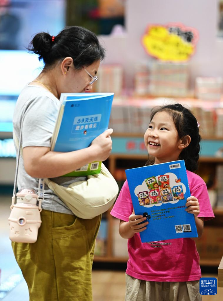 9月17日,家长陪着孩子在山东滕州书城挑选书籍。