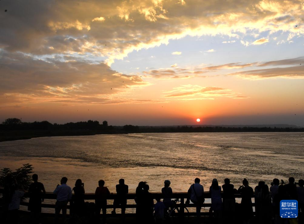 9月17日,游客在郑州黄河滩地公园南裹头广场观看黄河日落。