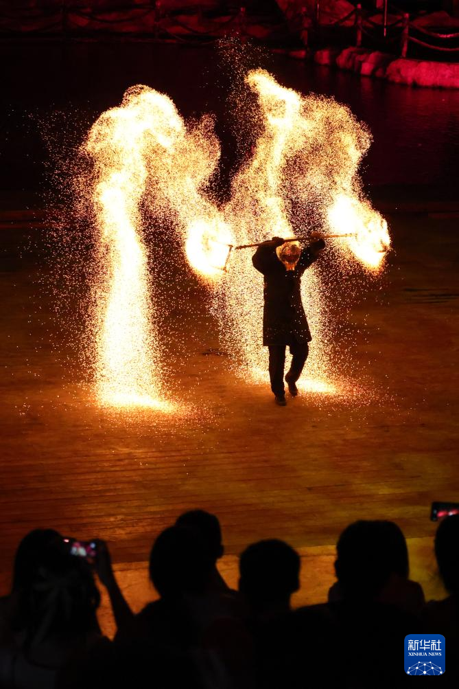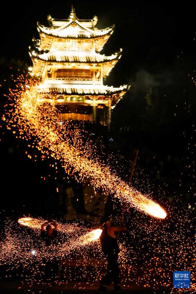 9月16日,表演者在安徽省黄山市休宁县齐云山景区为游客表演非遗炭花舞。