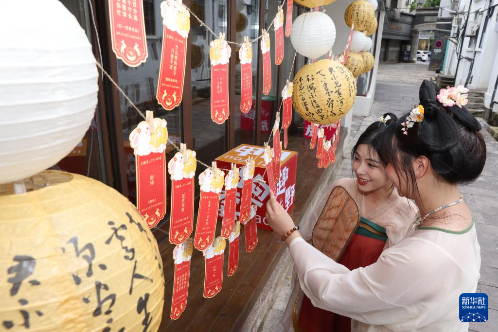 9月17日,市民游客在浙江省湖州市德清县乾元镇赵家弄猜灯谜。
