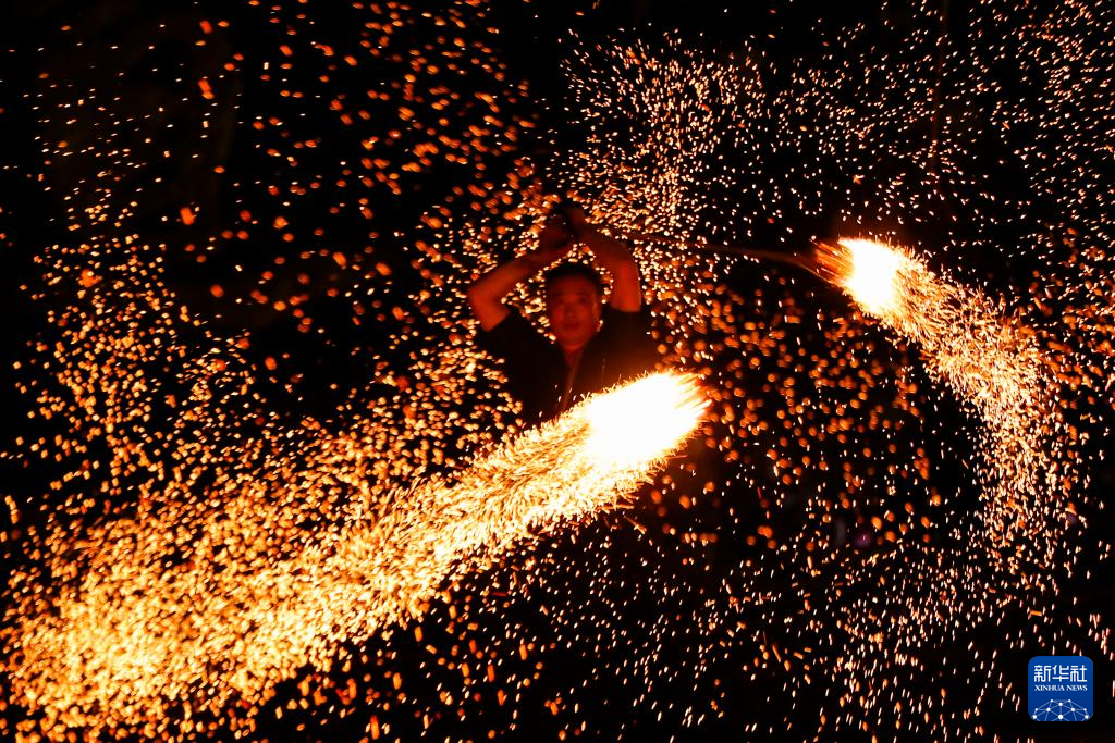 9月16日晚,民间艺人在河北省唐山市丰南区河头老街景区为游客表演打铁花(无人机照片)。