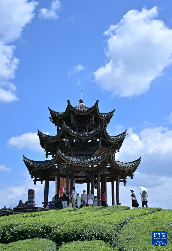 9月17日,游客在湖北省恩施土家族苗族自治州宣恩县万寨乡伍家台村的有机茶园里漫步游玩。
