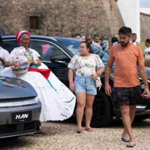 2023年7月4日,参观者在巴西巴伊亚州首府萨尔瓦多观看比亚迪纯电动汽车。新华社记者王天聪摄
