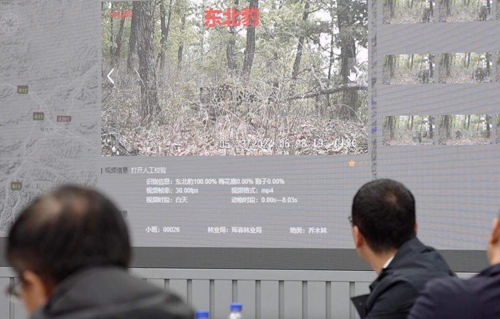 野生动物保护工作者在观看红外相机拍摄的野生东北豹影像。新华社记者 司晓帅 摄