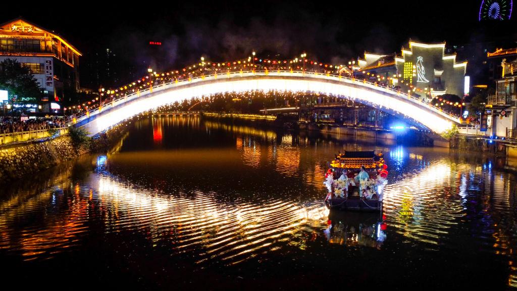 郴江河畔,华灯璀璨,清逸婉转的湘昆曲调自河上传来。在湖南郴州苏仙区裕后街历史文化街区,来自湖南省昆剧团的演员们乘坐花船巡游,吸引市民游客争相拍照留念。