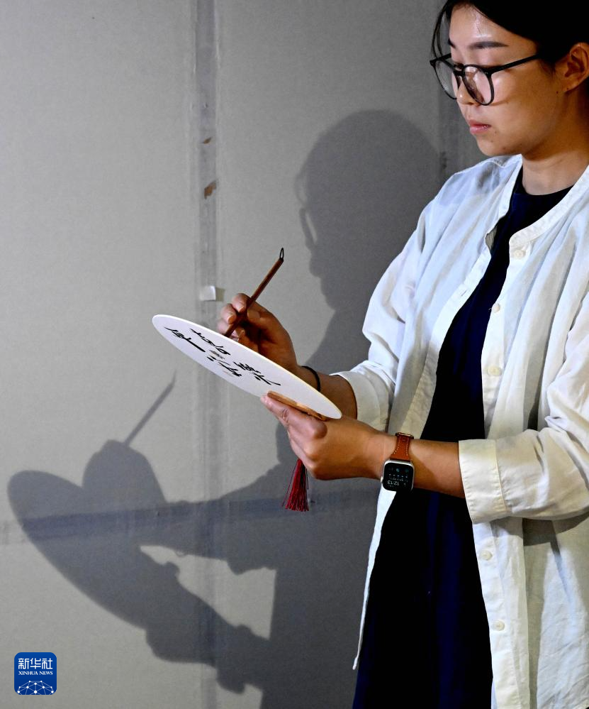 钱夏玉在洛阳华夏金石文化博物馆内进行金石博古画文创团扇创作(9月11日摄)。