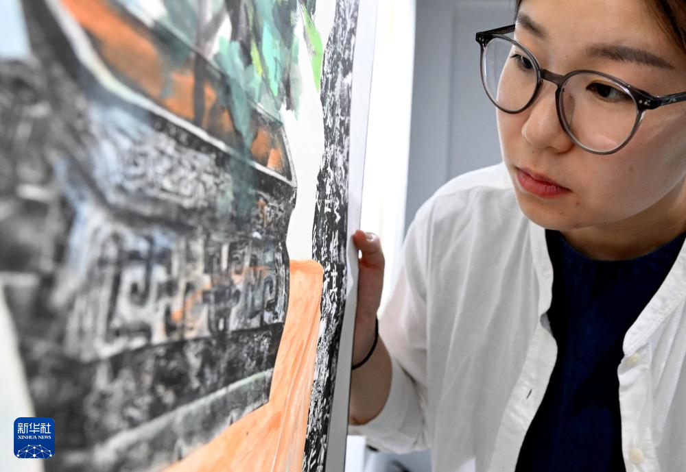 钱夏玉在洛阳龙门画院内扑墨(9月11日摄)。