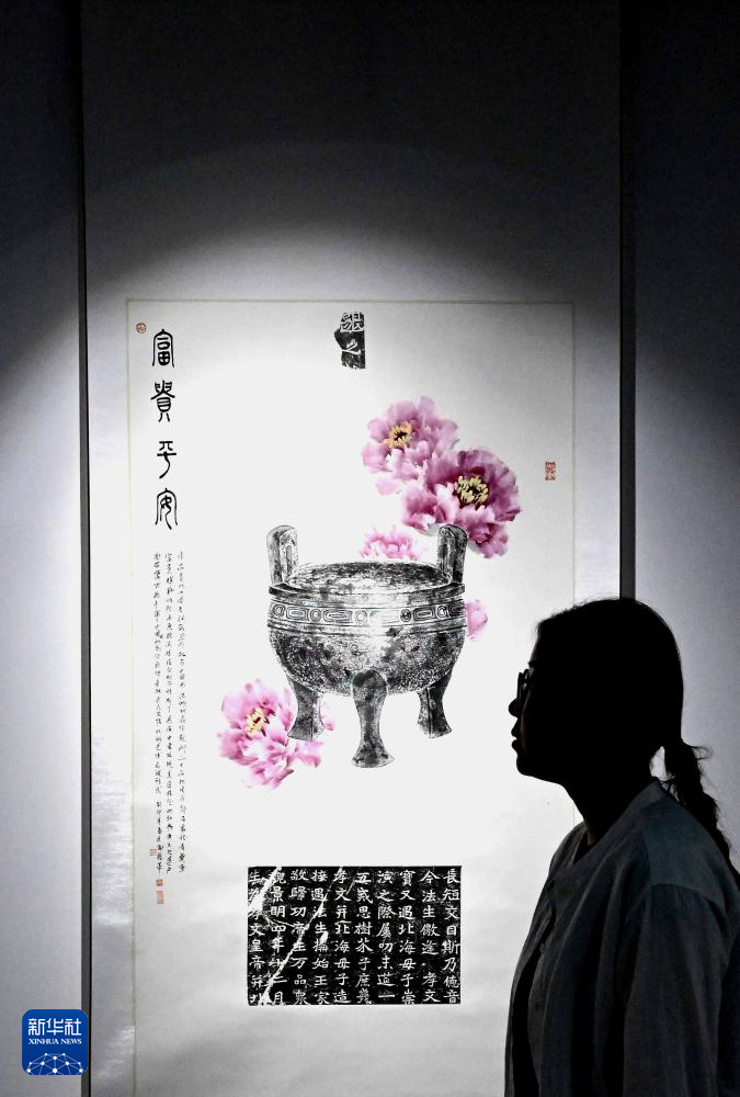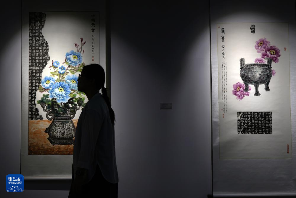 在洛阳华夏金石文化博物馆,钱夏玉在观看金石博古画成品(9月11日摄)。