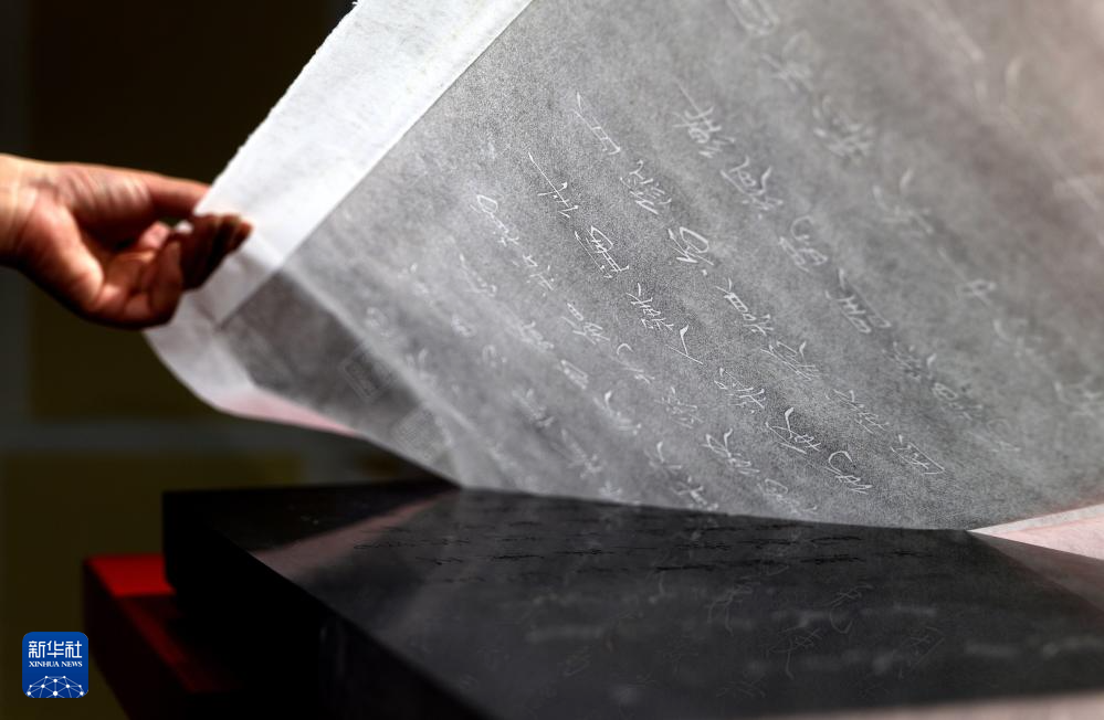 在洛阳华夏金石文化博物馆,钱夏玉将拓印完成的金石拓片揭下(9月11日摄)。