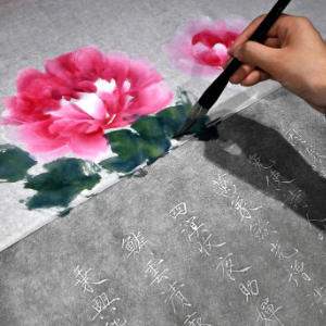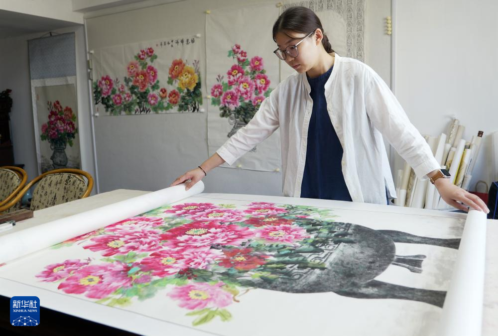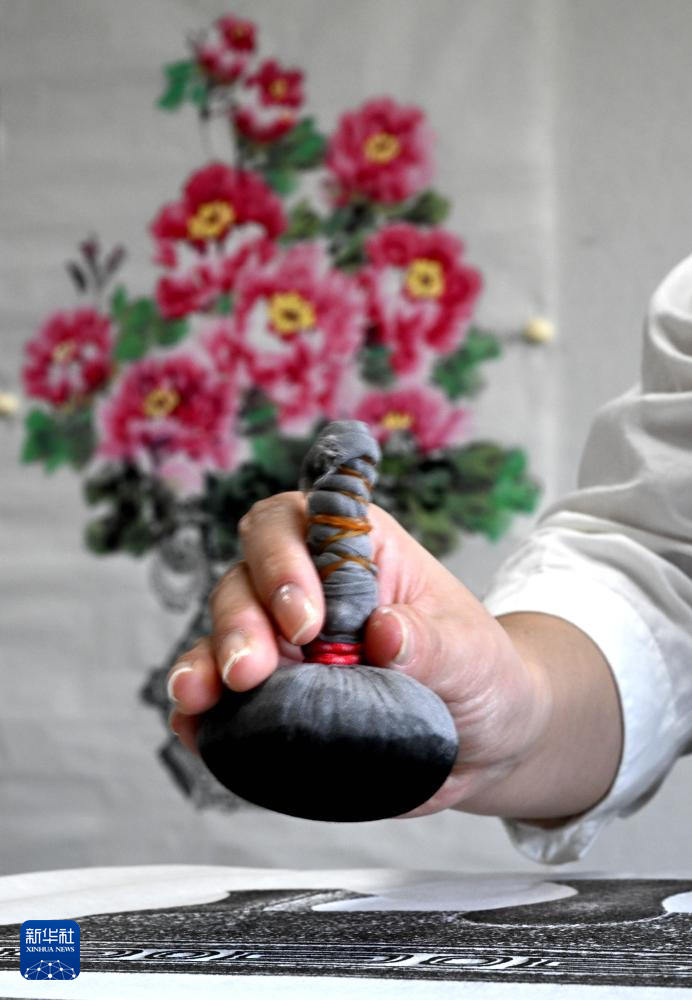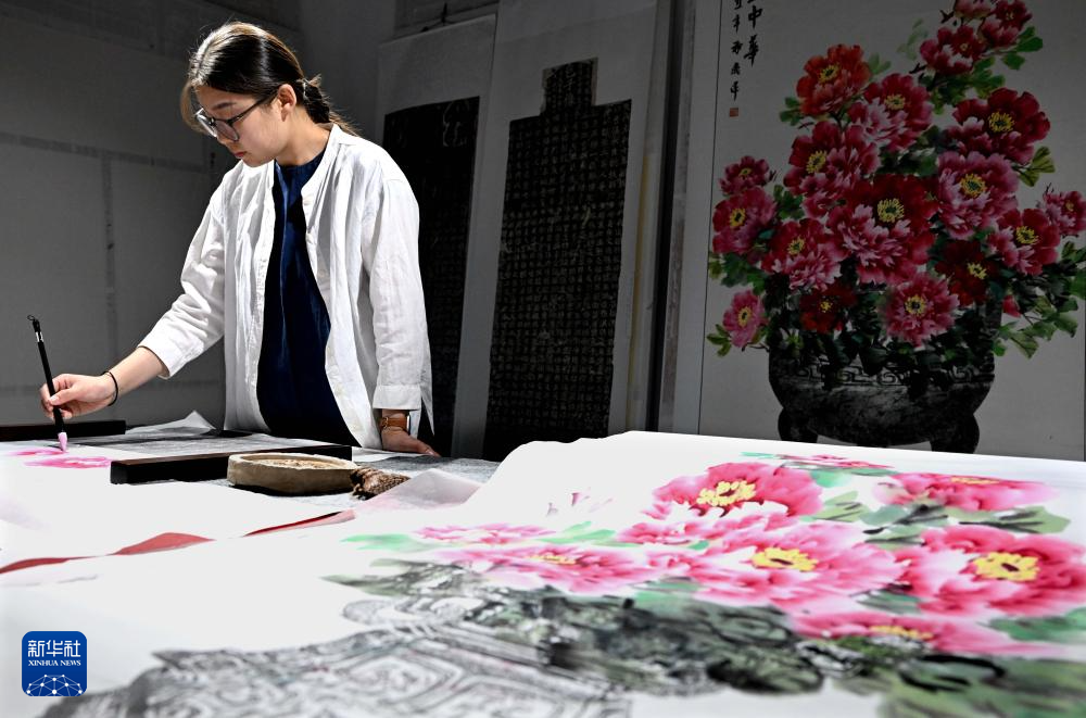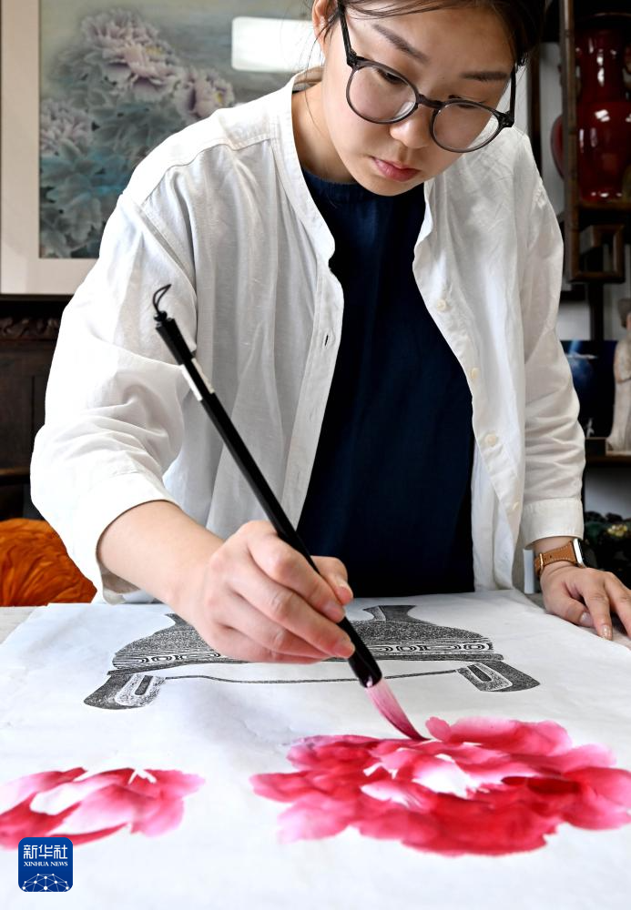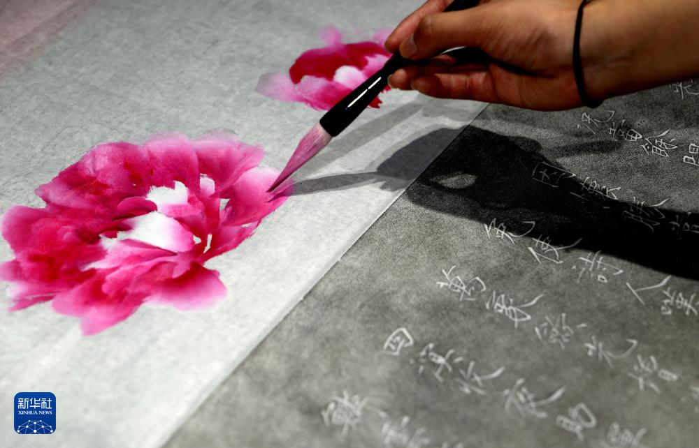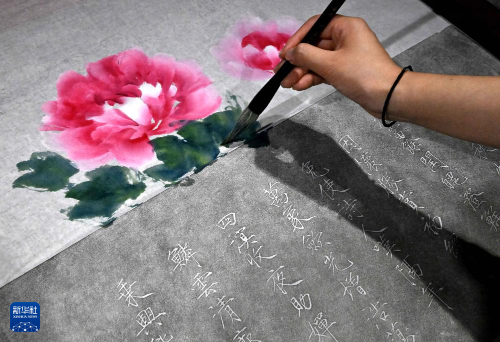 在洛阳龙门画院,钱夏玉在拓印完成的金石拓片上补绘牡丹画(9月11日摄)。