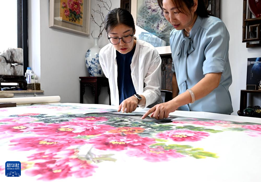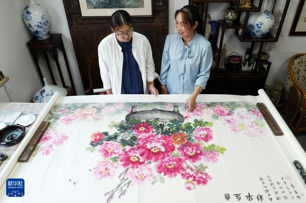 在洛阳龙门画院,钱夏玉与同事一同观看研究金石博古画成品(9月11日摄)。