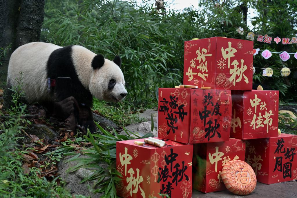 9月13日,大熊猫“香香”走向中秋礼盒。新华社记者 薛晨 摄