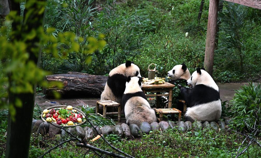 9月13日,大熊猫“云朵”一家在品尝美食。新华社记者 薛晨 摄