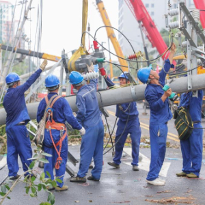 超强台风“摩羯”对文昌电网造成毁灭性打击,几乎要重建一个文昌配网。为帮助灾区尽快复电,南方电网从广东、广西、云南、贵州、海南集结了41000多名电力工人,其中在文昌抢修的就有13000多名。从应急发电,到抢修变电站、高压线、低压线,再到村里的支线,这里正在打响一场贯通群众用电“最后一公里”的攻坚战。