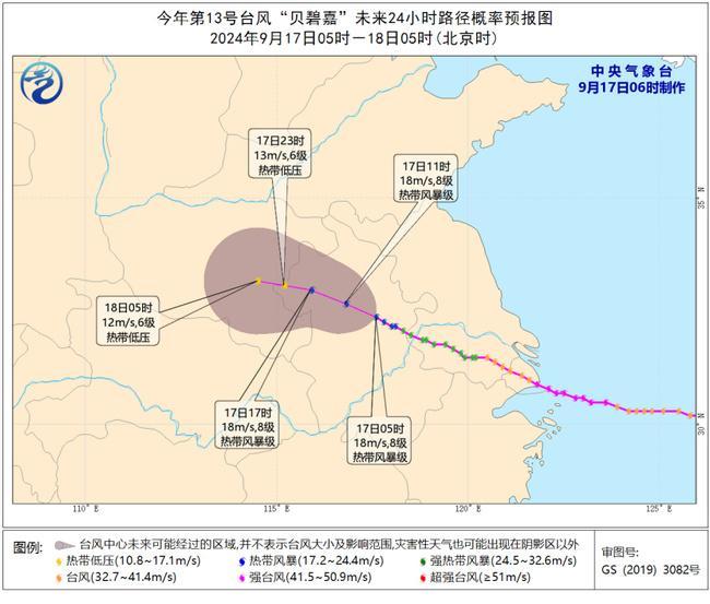 预计,“贝碧嘉”将以每小时15公里左右的速度向西偏北方向移动,强度逐渐减弱,将于今天夜间移入河南境内(热带低压,6级,12-13米/秒)。