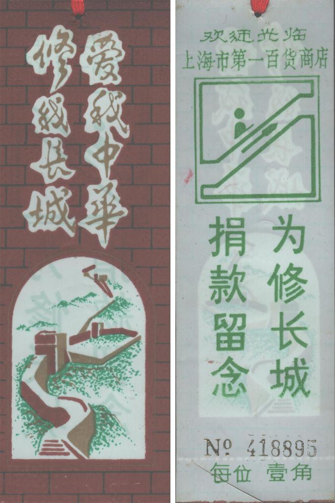 上海市第一百货商店“爱我中华 修我长城”捐款留念券(资料照片,收藏者孟宪利供图)。