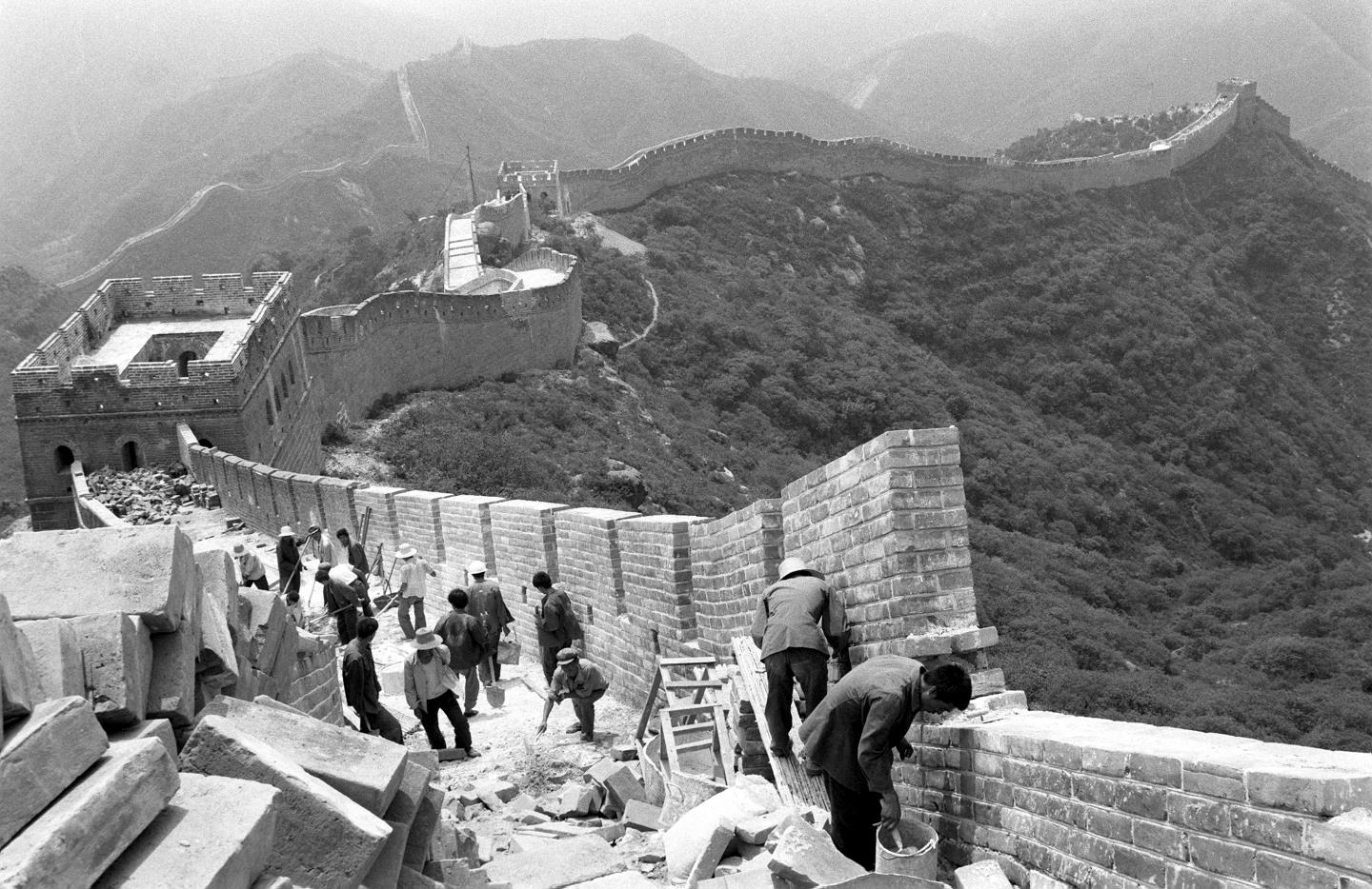 1984年,工人正在修整八达岭长城北七楼附近的一段城墙。这是用“爱我中华 修我长城”社会赞助活动所获款项进行修复的第一期工程。新华社记者 袁汝逊 摄