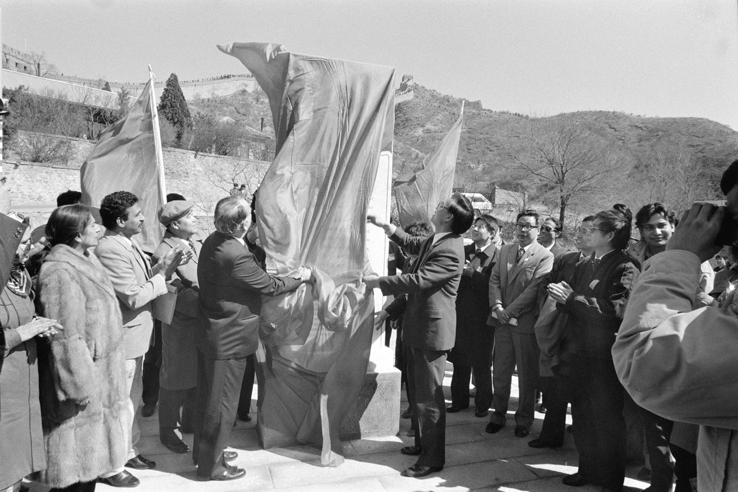 1989年3月20日,巴基斯坦政府赞助修复长城纪念碑揭幕仪式在北京八达岭长城举行。巴基斯坦时任驻华大使阿克拉姆·扎基(左四)参加了仪式。新华社记者 宋连峰 摄