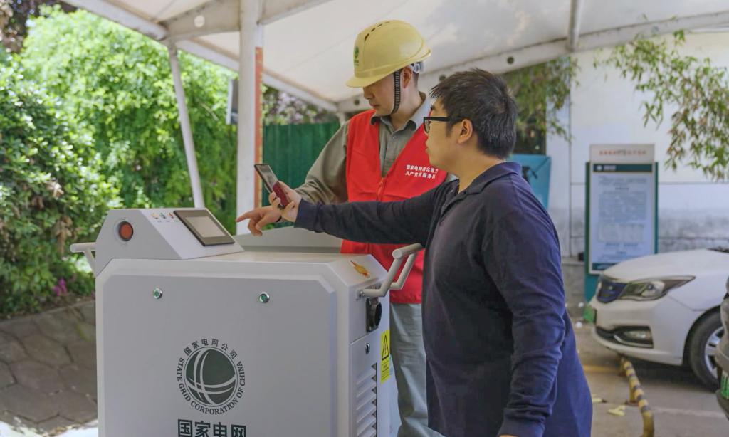 国网襄阳供电公司运维人员张志林协助用户使用移动充电桩充电。李俊蕾 摄