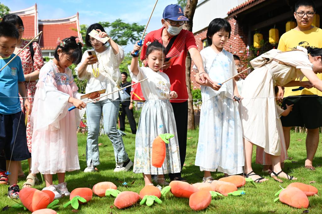 中秋节当天,莆田市荔城区北大村荔林水乡公园的中秋游园会现场人头攒动。花灯猜谜、飞花接令、投壶等一系列活动,引得人们跃跃欲试,而白塘玩月、流放平安灯等莆田独有的中秋习俗,更让不少游客眼前一亮。