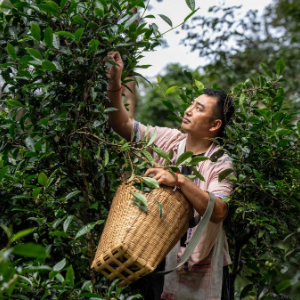 连日下雨,加上民宿生意好,村民扎约还剩最后一批秋茶顾不上采收。趁着天晴,扎约邀上寨里三五亲友,一同和他进山采茶。走出寨子没多远,就是扎约家的古茶园,在高大的乔木下,茶树高低错落与山林融为一体。