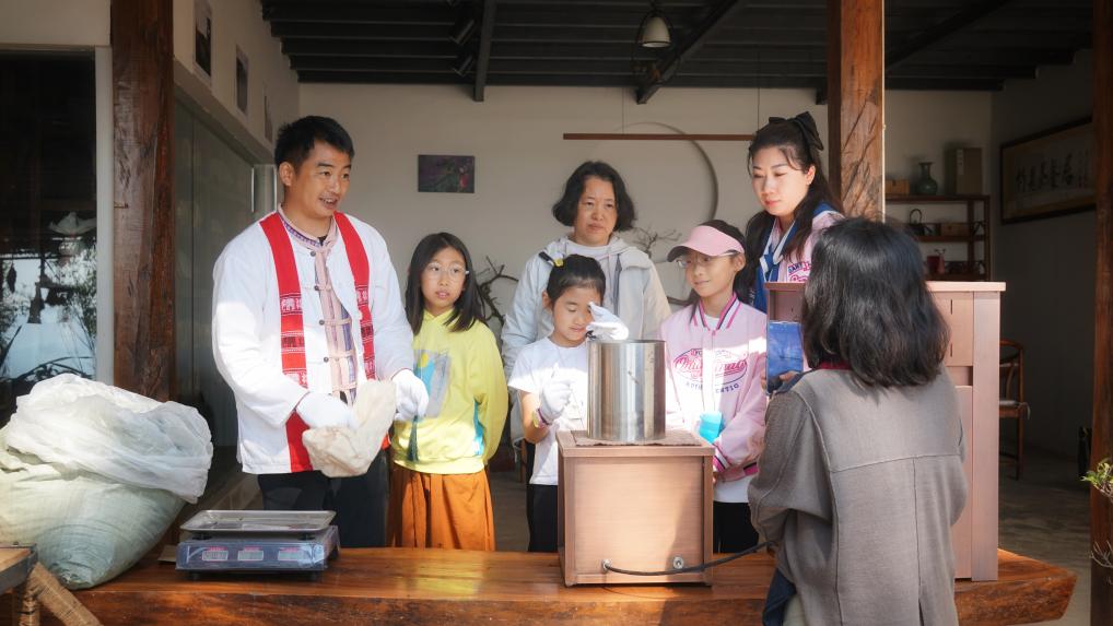 扎约(左一)带游客体验传统制茶。(受访者供图)