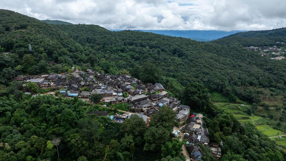被山林与茶园环绕的云南景迈山翁基古寨一景(无人机照片,9月13日摄)。新华社记者胡超 摄