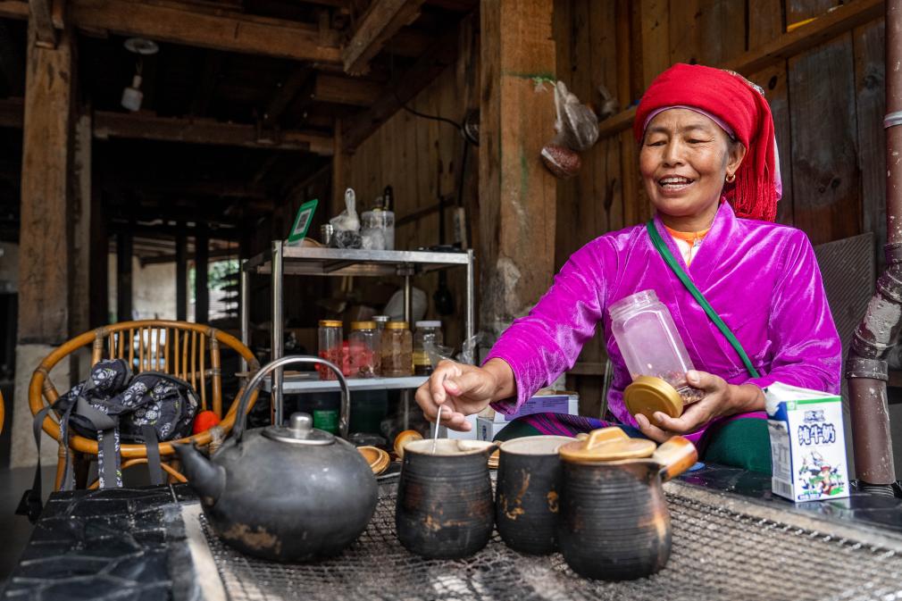 9月13日,58岁的布朗族奶奶女门在家门口做罐烤奶茶。新华社记者胡超 摄