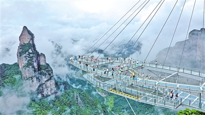 9月17日,游客在浙江省台州市仙居县神仙居景区南天顶玻璃观景台上游玩(无人机照片)。新华社发(王华斌 摄)