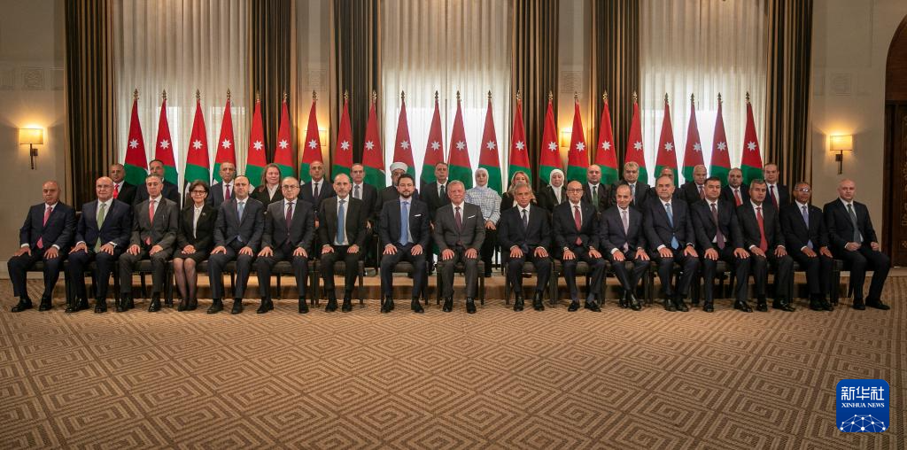 9月18日,在约旦安曼,约旦国王阿卜杜拉二世(前左九)与新首相加法尔·哈桑(前右八)及其他政府成员合影。新华社发(约旦王宫供图)