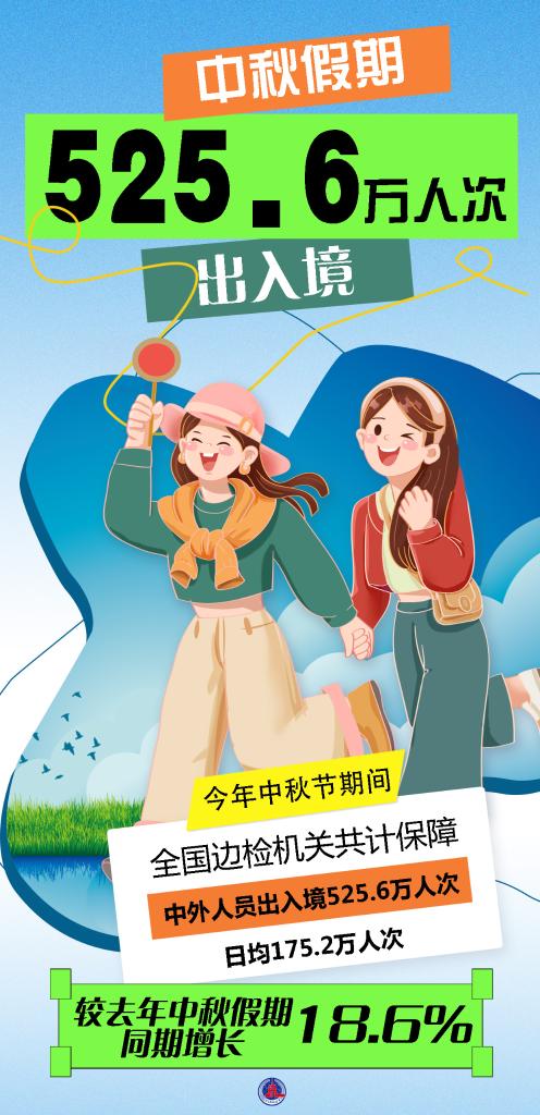新华社北京9月18日电(记者 任沁沁)国家移民管理局18日通报,今年中秋节期间全国边检机关共计保障525.6万人次中外人员出入境,日均175.2万人次,较去年中秋假期同期增长18.6%。