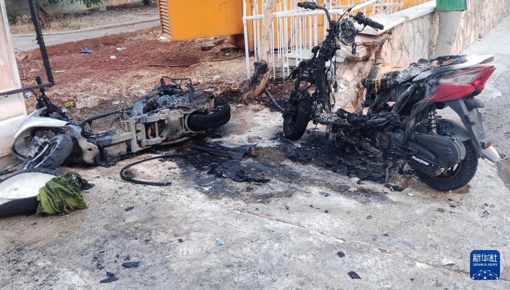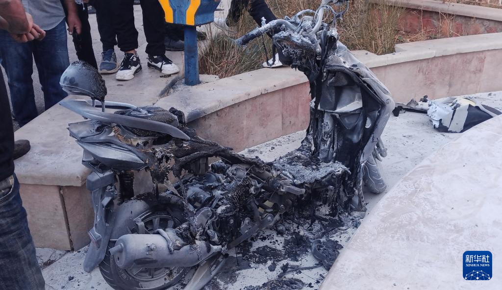 这张9月18日在黎巴嫩巴勒贝克拍摄的照片显示的是通信设备爆炸损毁的摩托车。 新华社发(塔希尔·阿布·哈姆丹摄)