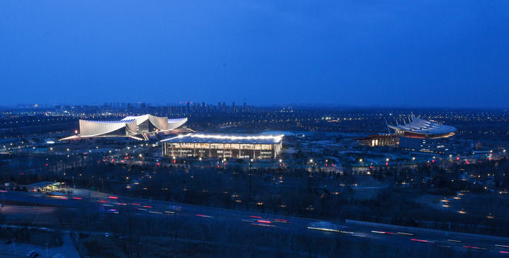 北京艺术中心、北京城市图书馆和北京大运河博物馆夜景(从左至右,2024年2月28日摄)。新华社记者 鞠焕宗 摄